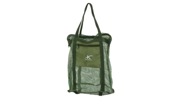 Borsa a rete per funghi con fondo preformato, apertura a zip e taschino. Ripiegabile, leggera e traspirante, ideale per la raccolta nei boschi.