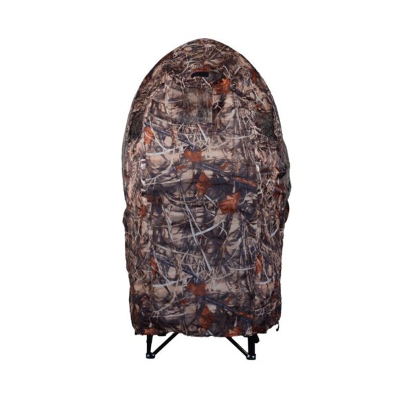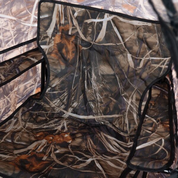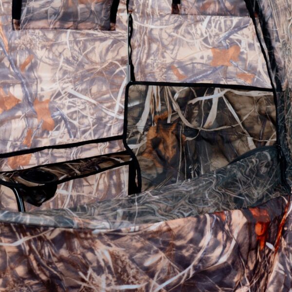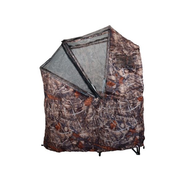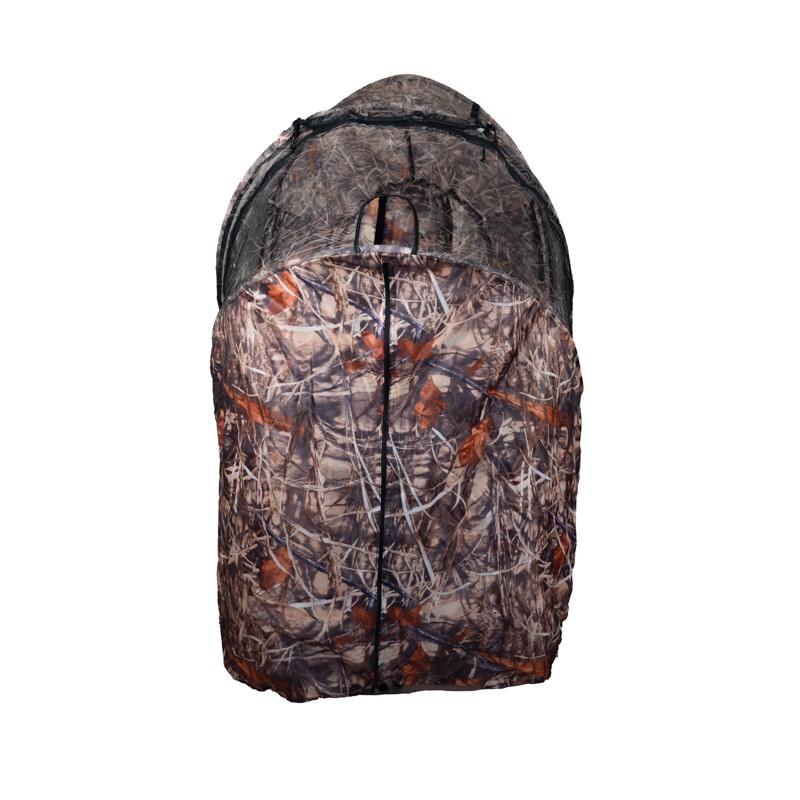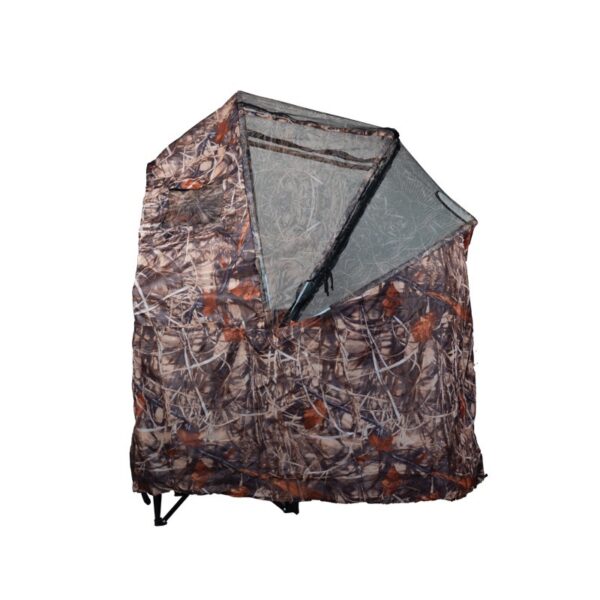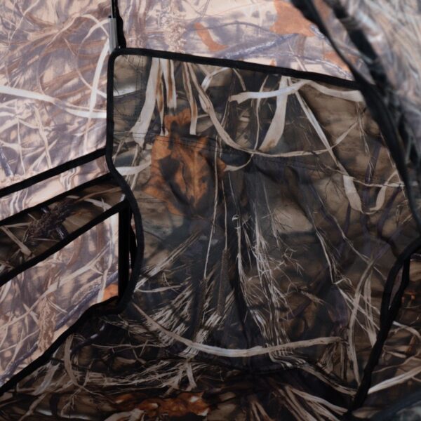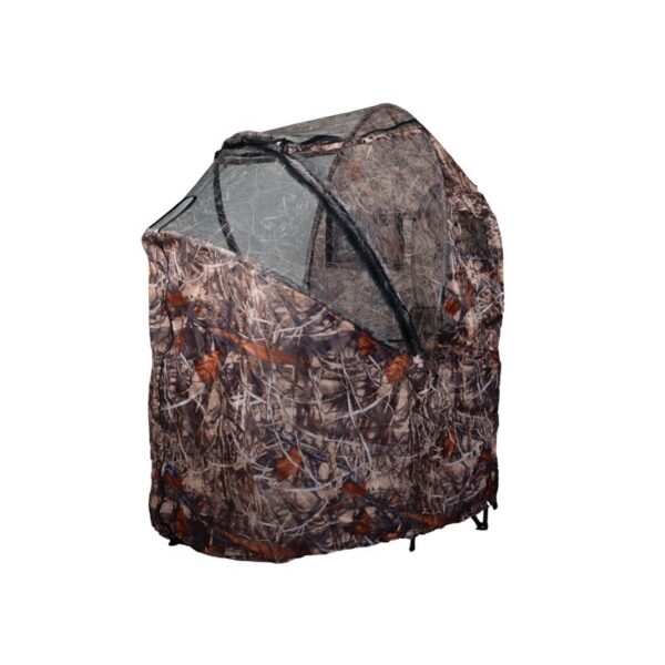 La sedia integrata consente di risparmiare spazio e peso, mentre la rete semitrasparente removibile permette di osservare l’ambiente circostante mantenendo un’eccellente copertura visiva. L’apertura frontale con zip centrale assicura un accesso immediato e silenzioso, ideale per la caccia agli acquatici, ai colombacci o per le attese da appostamento.