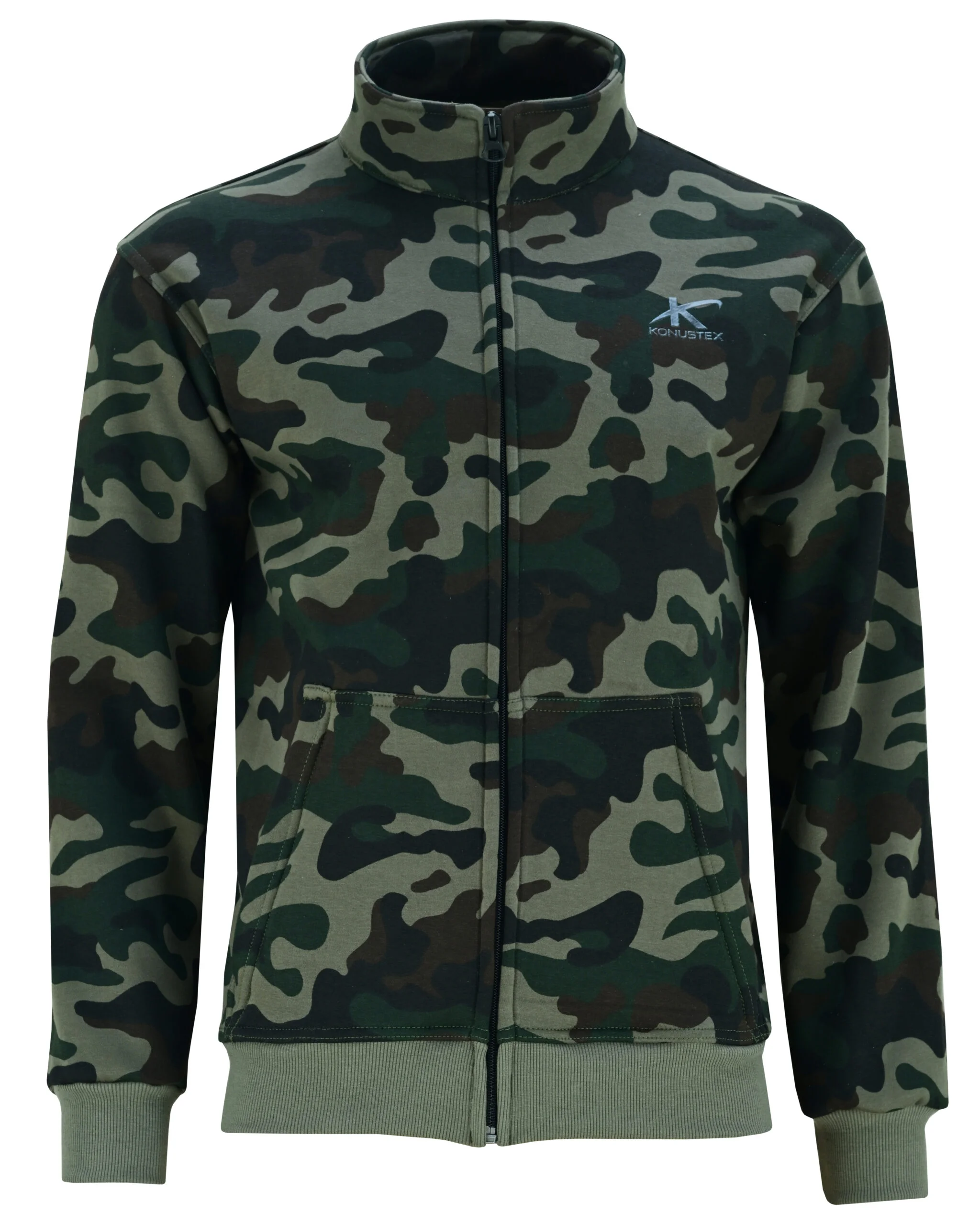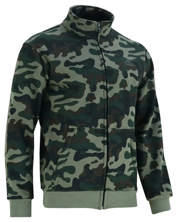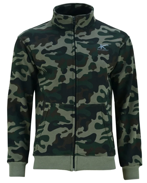 Felpa mimetica Konustex Lyseo Mimetic con tasche YKK e rinforzi sui gomiti. Ideale per caccia e attività outdoor autunnali.