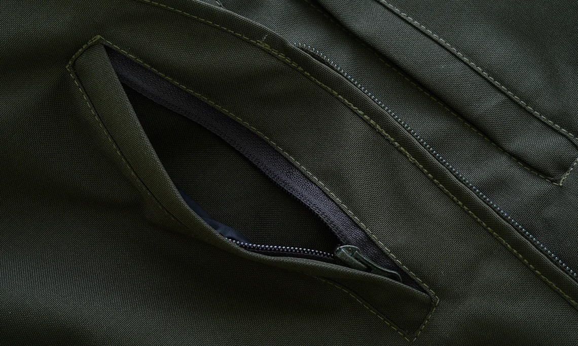 Sul fronte presenta due ampi tasconi a soffietto con pattina e automatico, oltre a due taschini con zip sul petto, perfetti per accessori o documenti. Nella parte posteriore รจ dotato di una cacciatora con parte inferiore lavabile e occhielli di scolo, pratica e resistente.