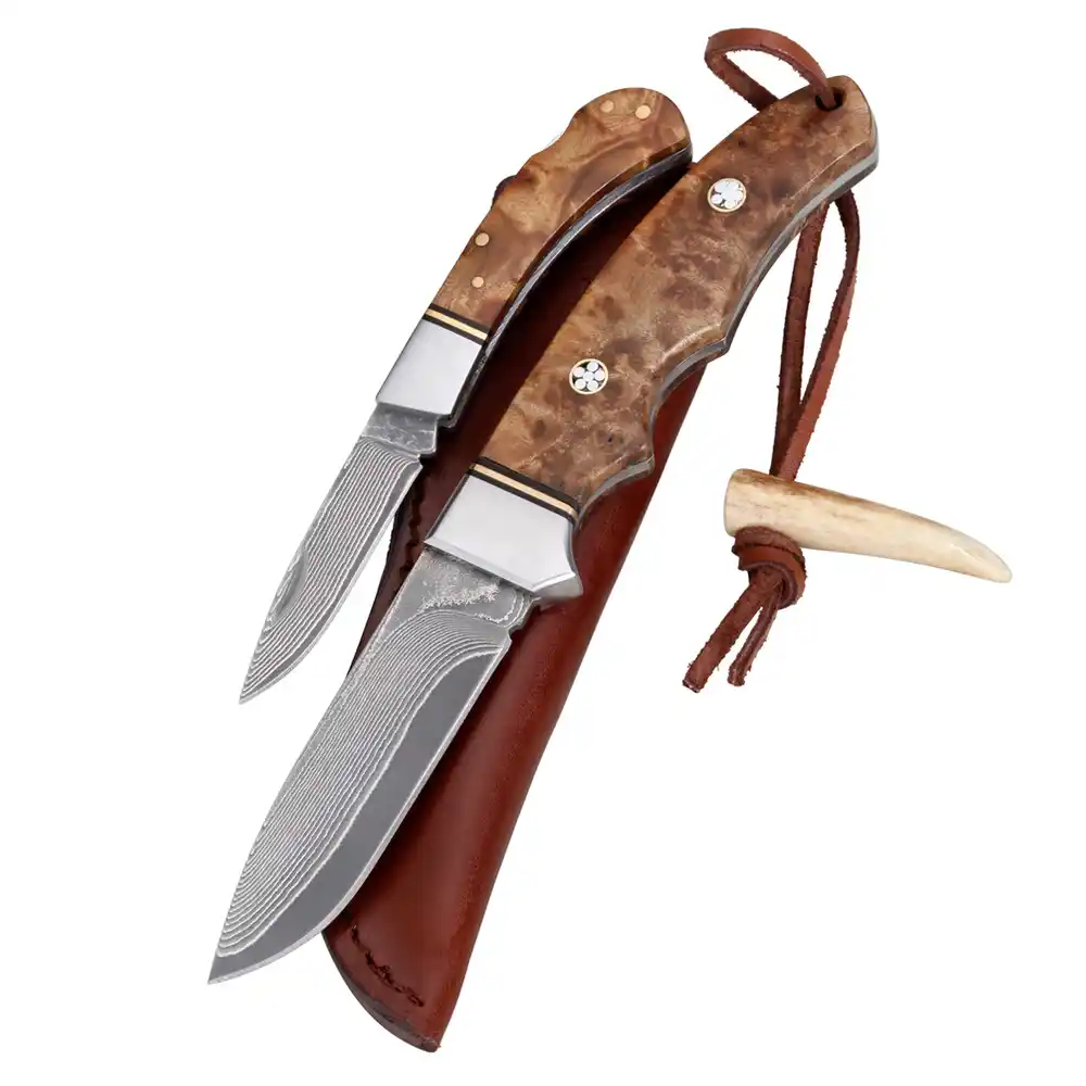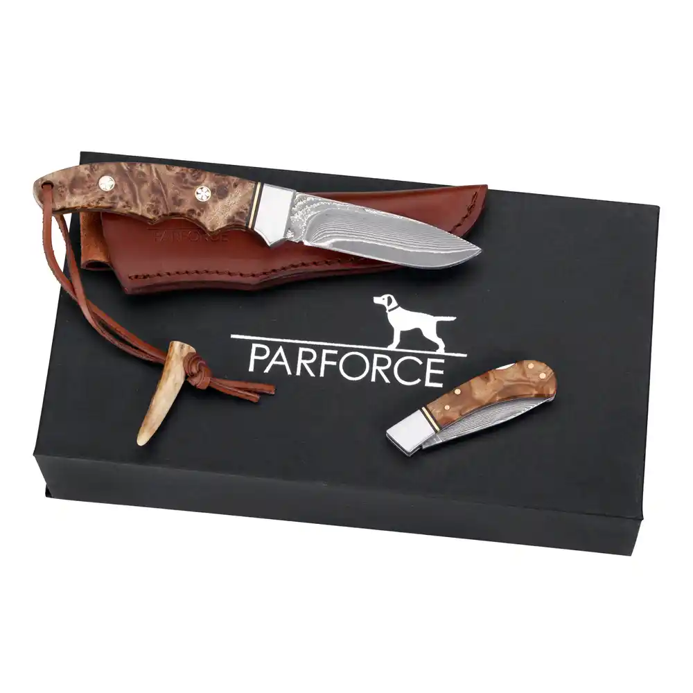 Set Parforce con coltello a lama fissa e pieghevole in damasco, manico in radica e fodero in cuoio, ideale per outdoor e come idea regalo.