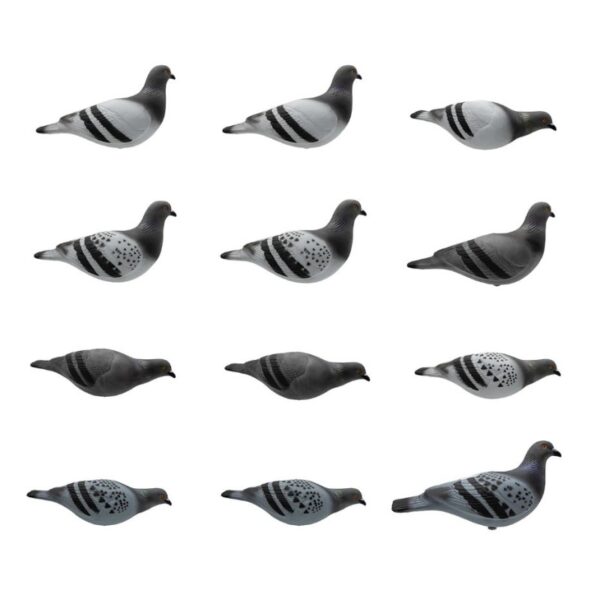 Set da 12 stampi piccione FINAL APPROACH con 4 colorazioni di piumaggio e basi incluse, dimensioni maggiori del vero per richiamo realistico.